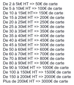 Pour les membres de la Communauté Mastermind, nous avons négocié un "cash back" pour tout investissement réalisé auprès de cette société, qui correspondant à 2% du montant de la facture HT et qui se fera sous forme de carte cadeau (au choix : "Maison du Monde" ou "Castorama" ou "Leroy Merlin" ou "Ikéa" ou "Amazon"). La carte cadeau vous sera remise lorsque le projet d'investissement aura été à son terme, c'est à dire la réalisation effective.